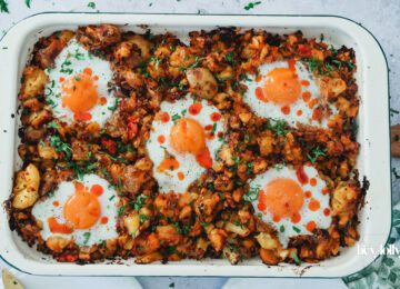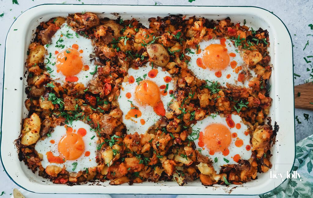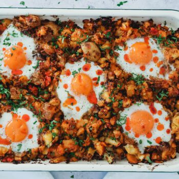 Sprout and Harissa Potato Hash with Sunny-Side Eggs